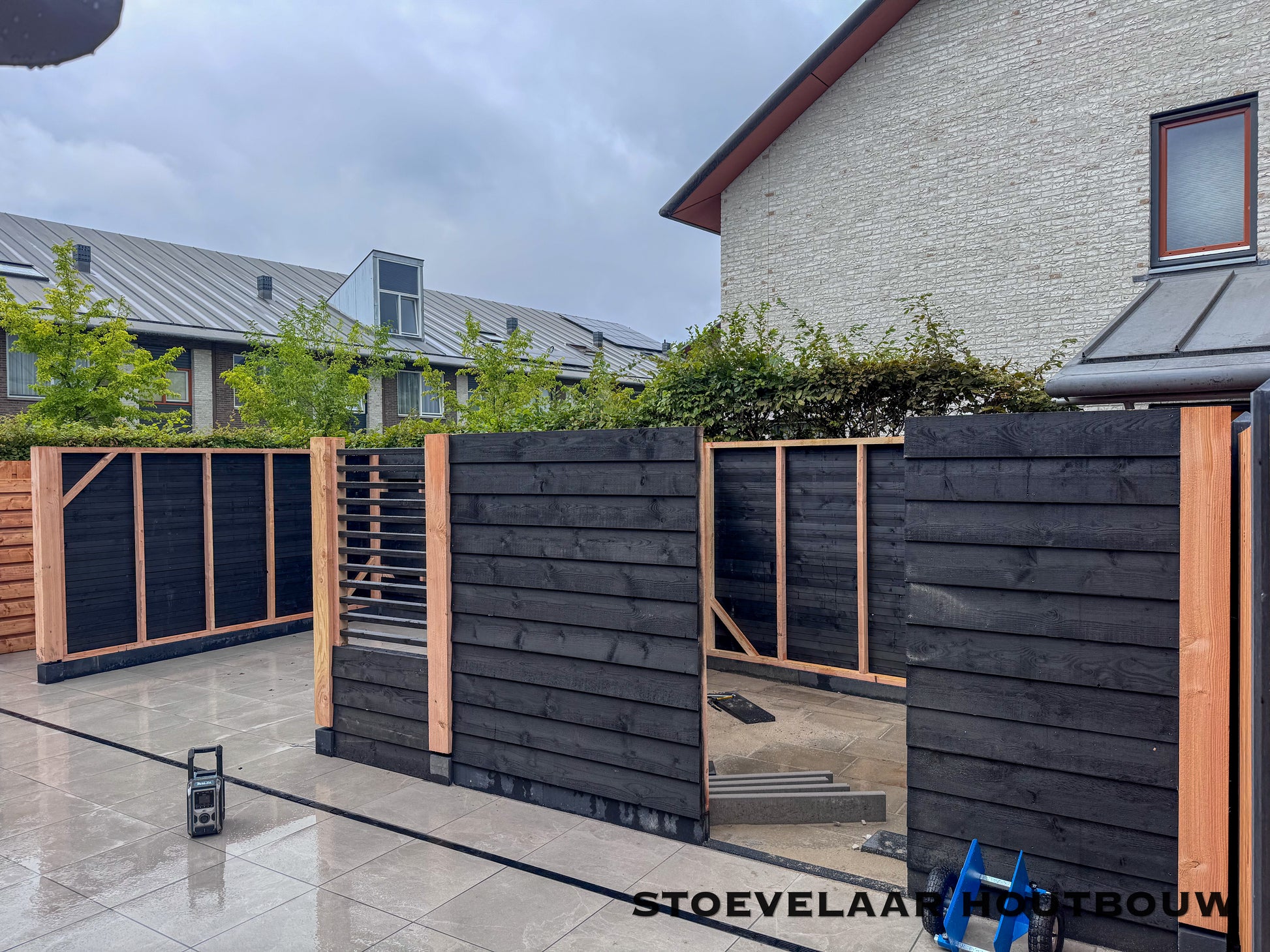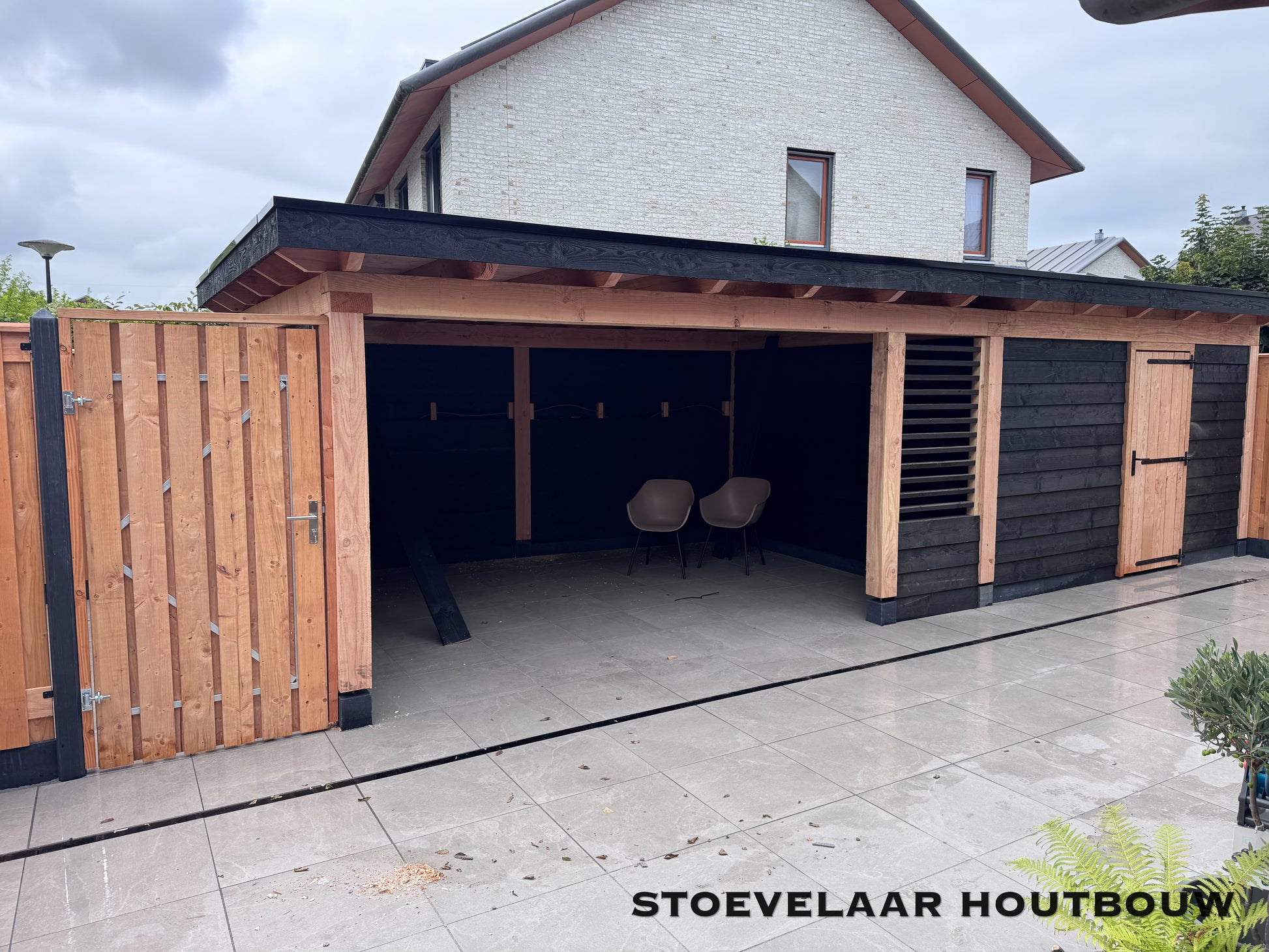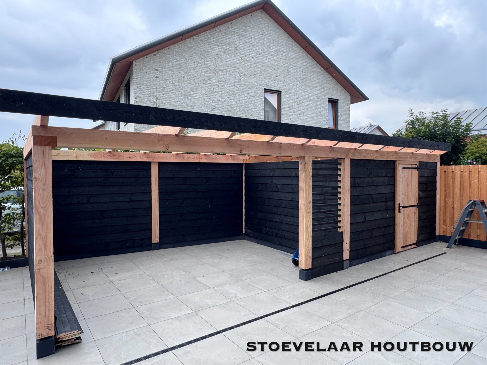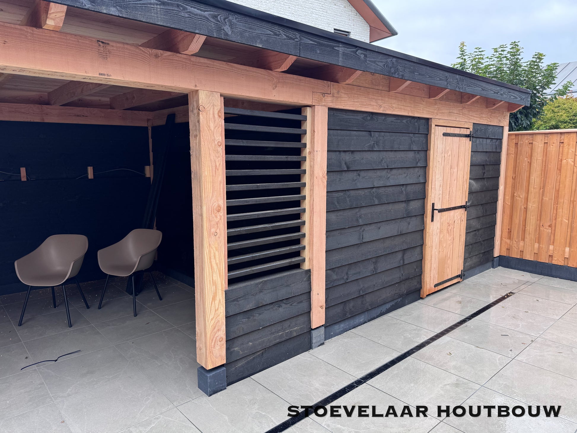 Deze overkapping van 950x450 cm kan prefab worden geplaatst of worden afgehaald met een bouwtekening. Met een mooie overstek van schuine klossen en een shutterscherm is dit toch een perfecte oplossing voor de toekomstige glazen schuifwand die daar later achter komt te vallen.