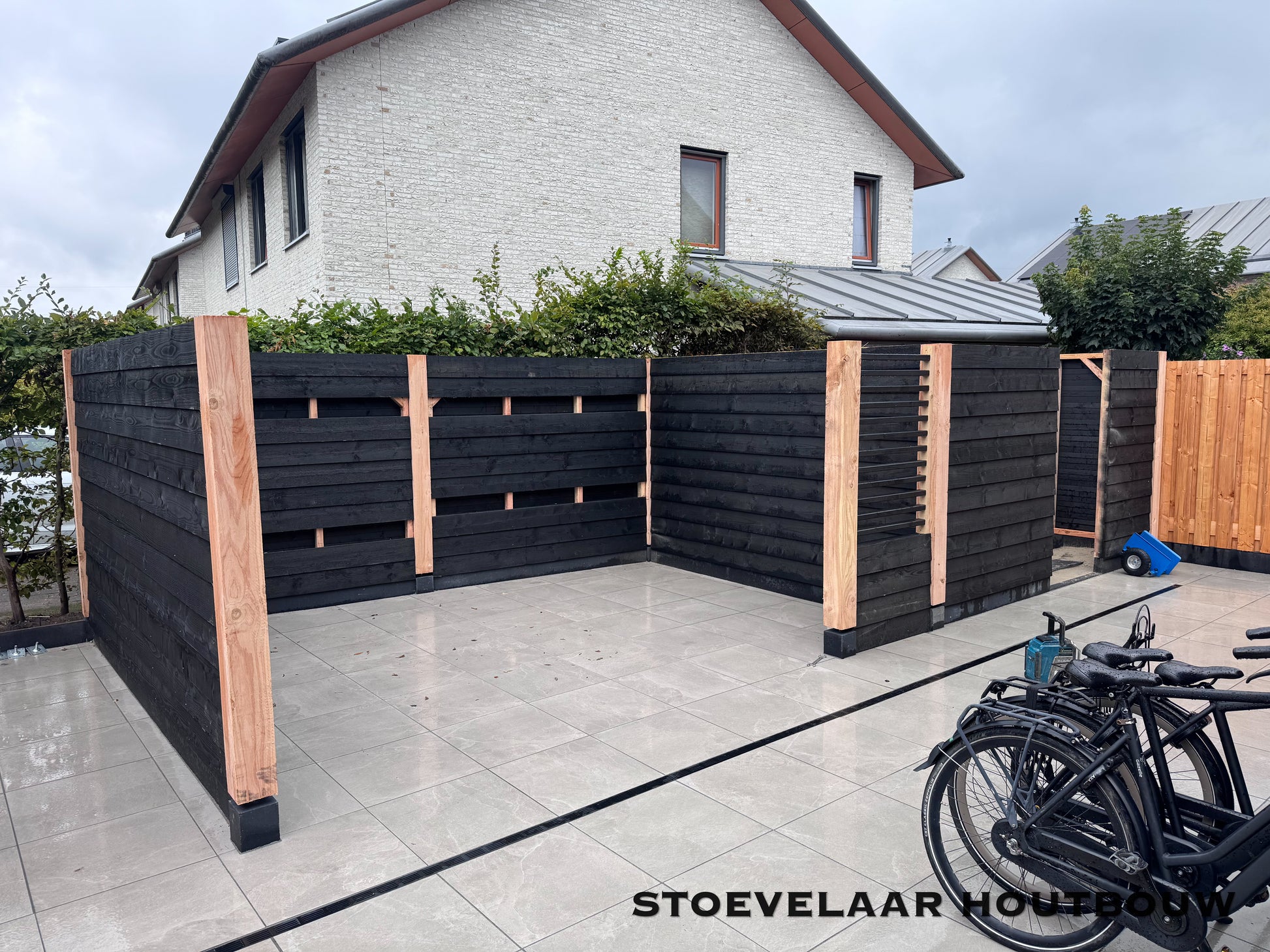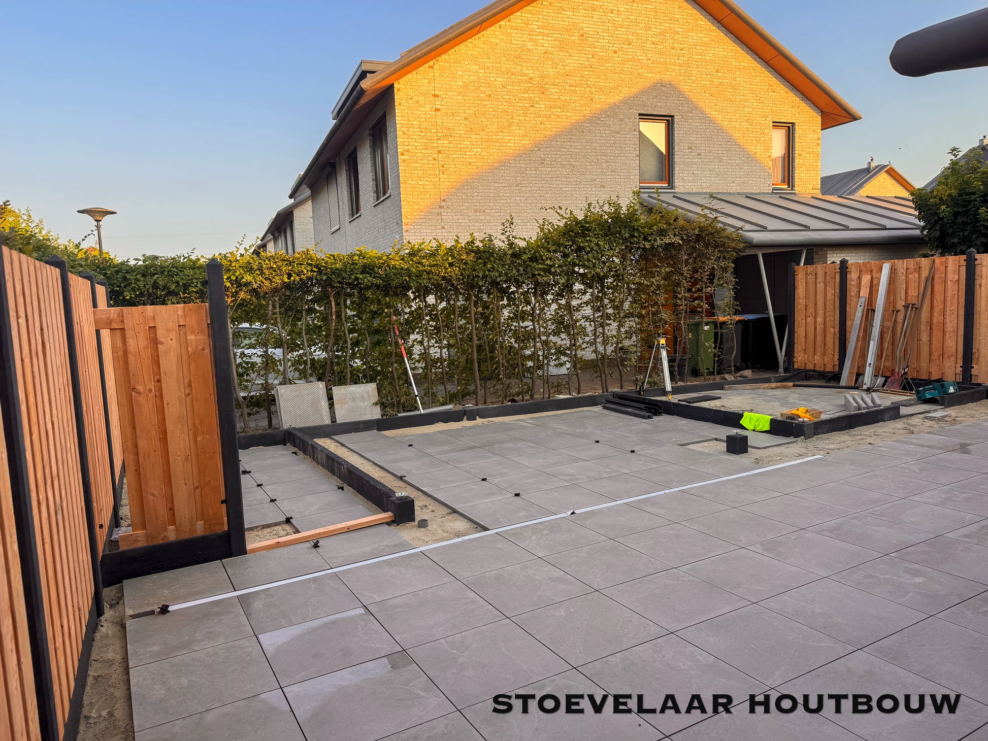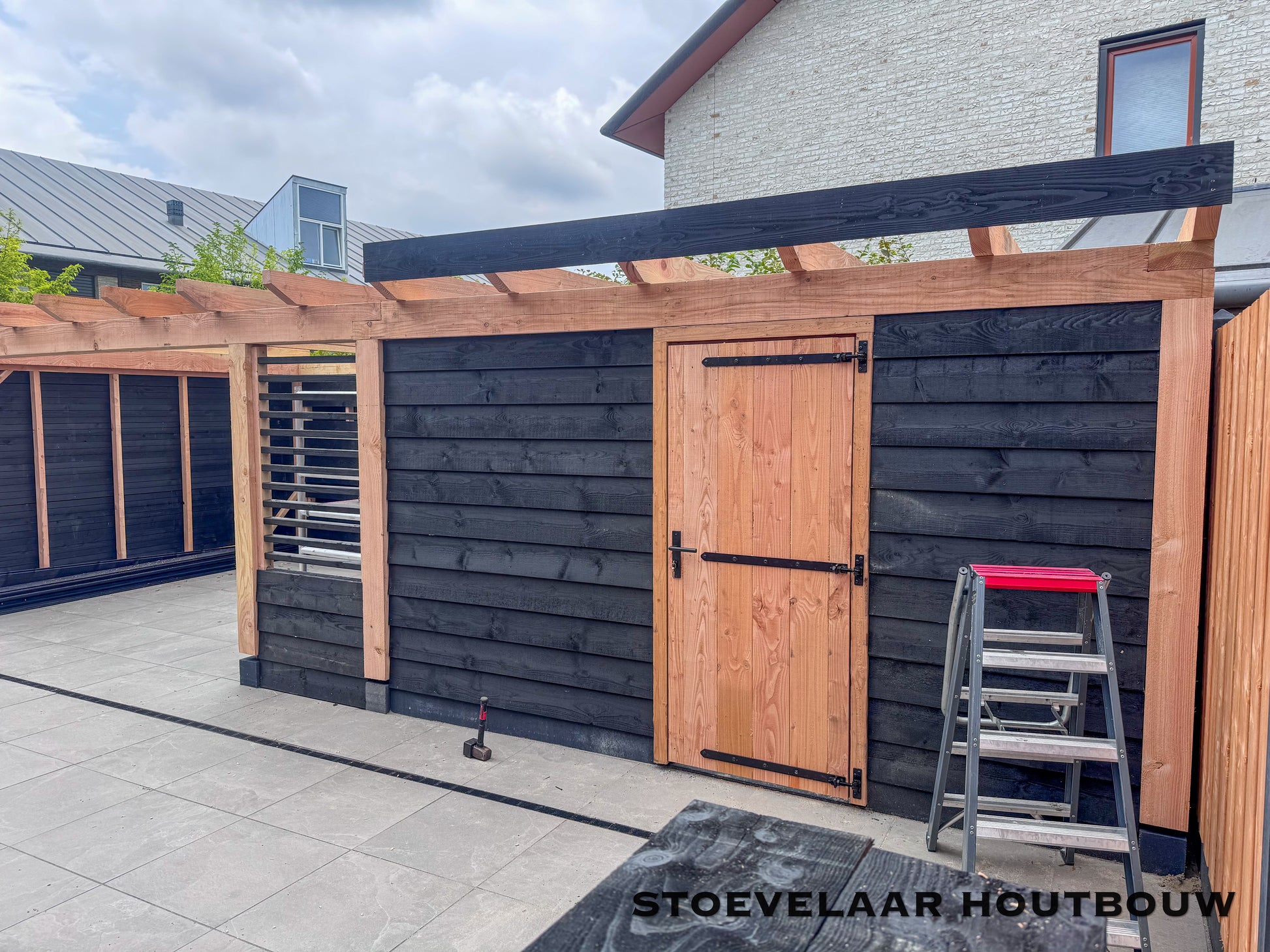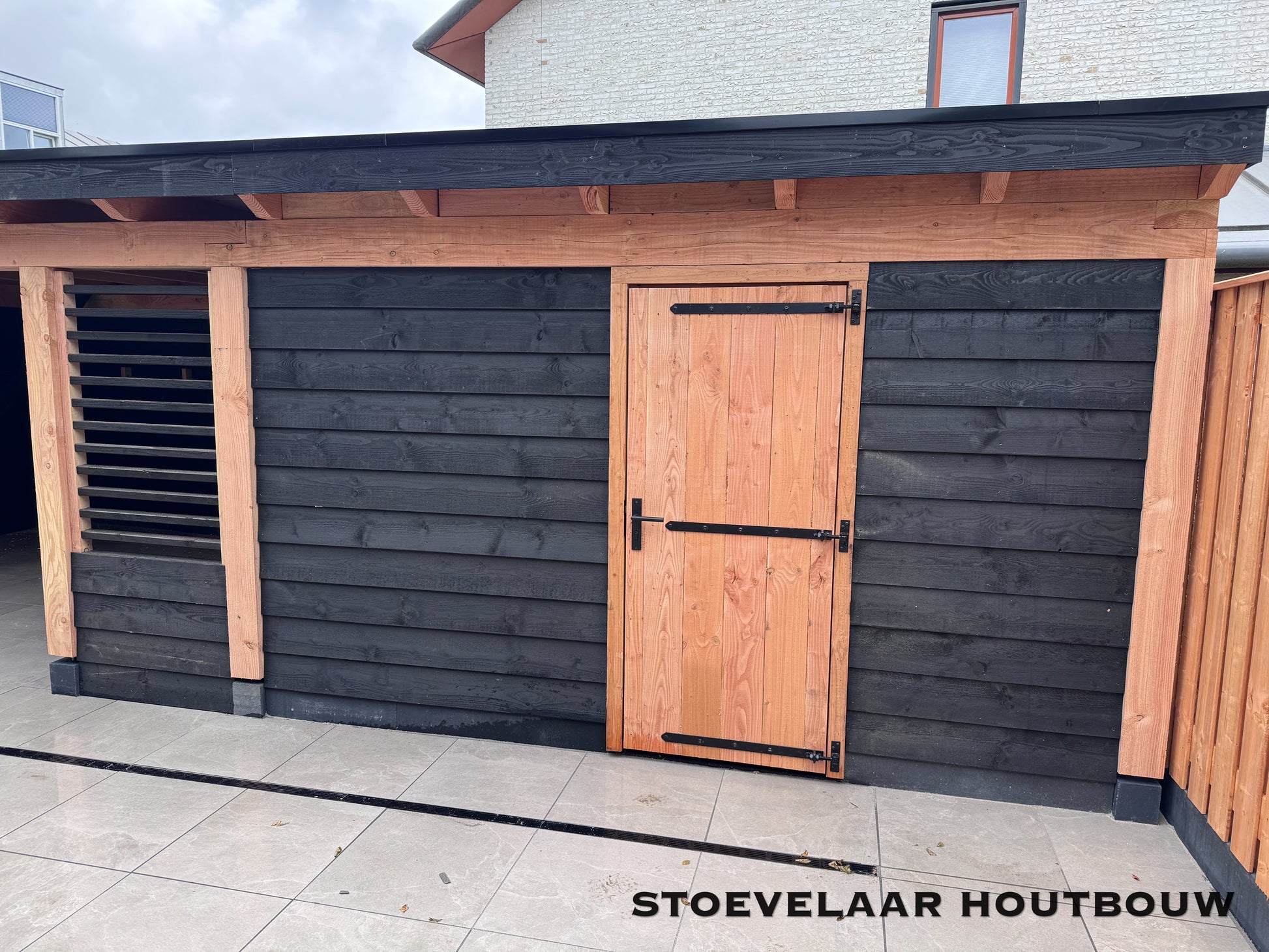 Deze overkapping van 950x450 cm kan prefab worden geplaatst of worden afgehaald met een bouwtekening. Met een mooie overstek van schuine klossen en een shutterscherm is dit toch een perfecte oplossing voor de toekomstige glazen schuifwand die daar later achter komt te vallen.
