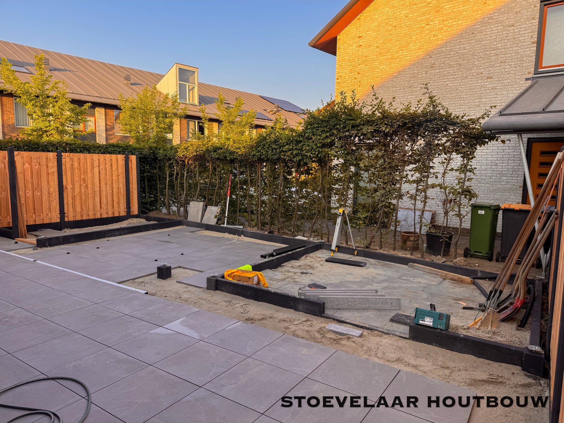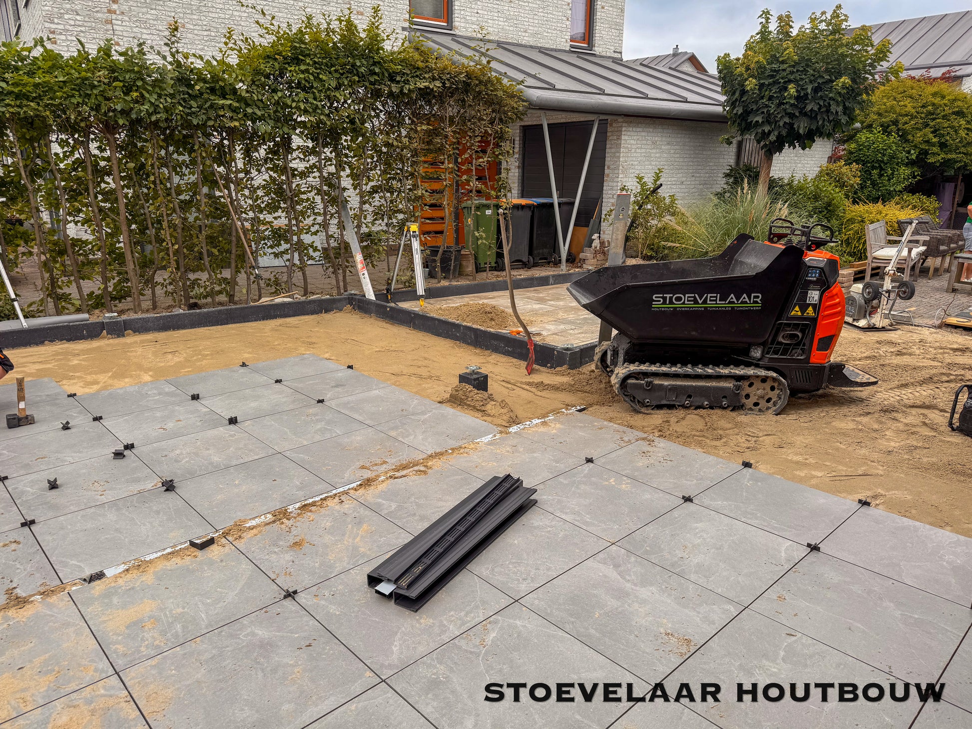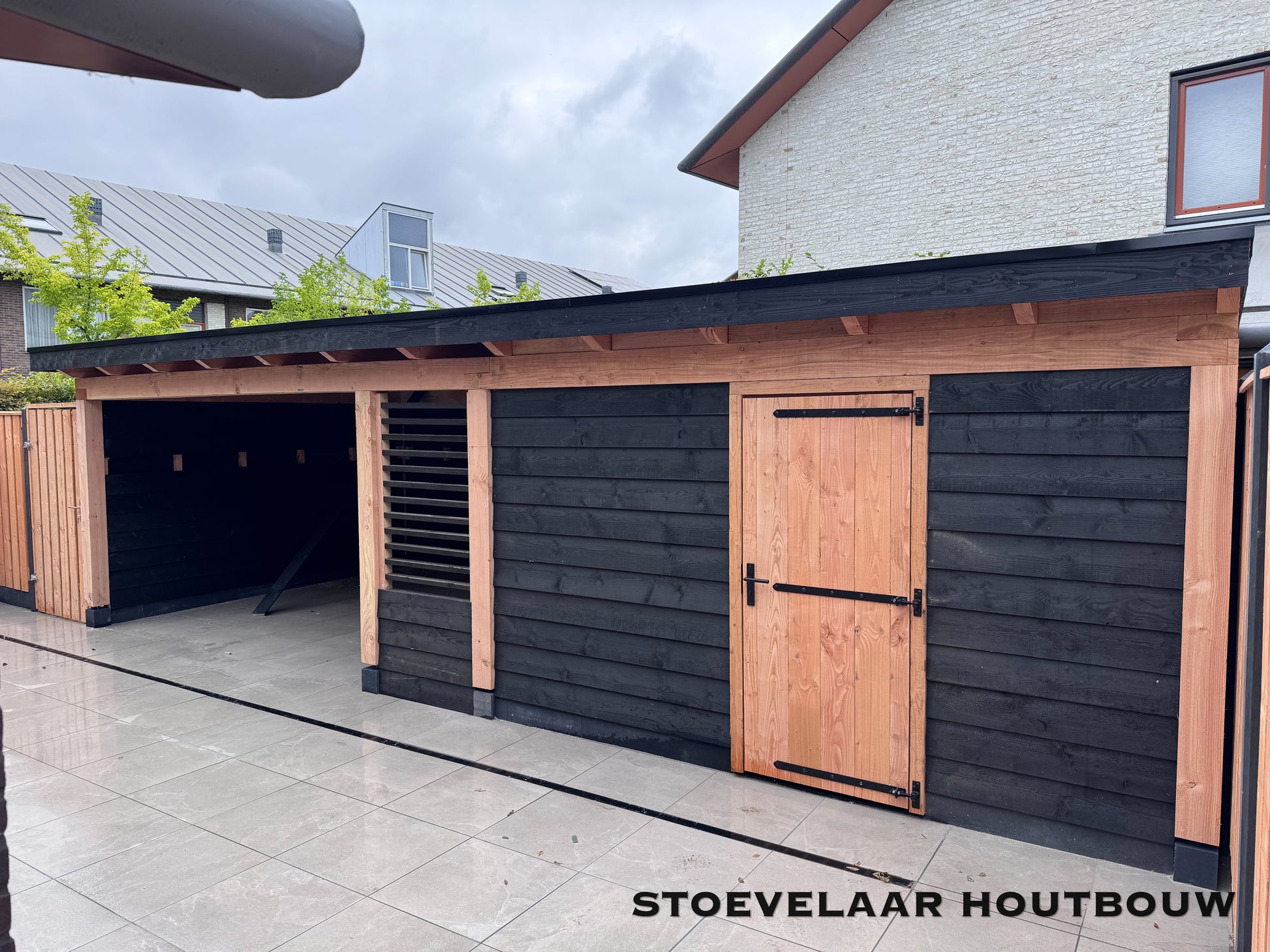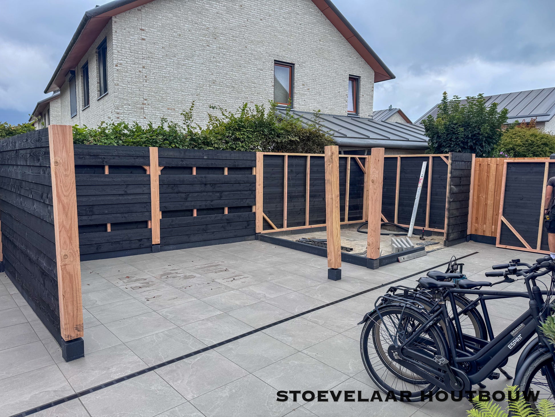 Deze overkapping van 950x450 cm kan prefab worden geplaatst of worden afgehaald met een bouwtekening. Met een mooie overstek van schuine klossen en een shutterscherm is dit toch een perfecte oplossing voor de toekomstige glazen schuifwand die daar later achter komt te vallen.